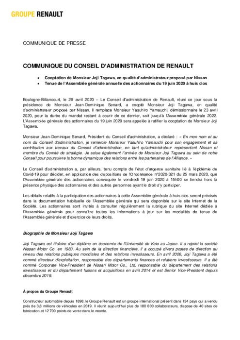 Le Conseil d’administration de Renault, réuni ce jour sous la présidence de Monsieur Jean-Dominique Senard, a coopté Monsieur Joji Tagawa, en qualité d’administrateur proposé par Nissan. Il remplace Monsieur Yasuhiro Yamauchi, démissionnaire le 23 avril 2020, pour la durée du mandat restant à courir de ce dernier, soit jusqu’à l’Assemblée générale 2022. L’Assemblée générale des actionnaires du 19 juin 2020 sera appelée à ratifier la cooptation de Monsieur Joji Tagawa.