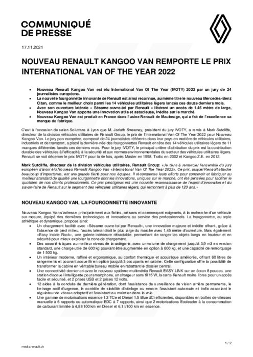 Nouveau Renault Kangoo Van est élu International Van Of The Year (IVOTY) 2022 par un jury de 24 journalistes européens. La nouvelle fourgonnette innovante de Renault est ainsi reconnue, au même titre le nouveau Mercedes-Benz Citan, comme le meilleur choix parmi les 14 véhicules utilitaires légers lancés ces douze derniers mois. Avec son ouverture latérale « Sésame ouvre-toi par Renault » libérant un accès de 1,45 mètre de large, Nouveau Kangoo Van apporte une innovation utile et astucieuse...