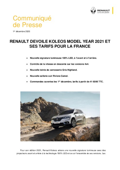 Pour son édition 2021, Renault Koleos arbore une nouvelle signature lumineuse avec des projecteurs avant et arrière à la technologie 100% LED et ce sur l’ensemble de ses versions. Les feux avant LED assurent une performance d’éclairage supérieure de 25% par rapport à la technologie halogène, tout en diminuant la consommation énergétique de 10%. A l’arrière, les feux 3D LED intègrent des clignotants à défilement dès la finition Intens.