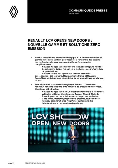 Constructeurs 24 mars 2021 - 07:45 Renault présente une extension stratégique et un renouvellement de sa gamme de véhicule utilitaire pour répondre à l’ensemble des besoins des professionnels, avec une double offre de fourgonnettes complémentaires... PDF (428 Ko) Télécharger