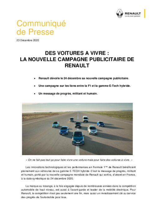 Les innovations technologiques et les performances en Formule 1 de Renault bénéficient pleinement aux véhicules de sa gamme E-TECH hybride. C’est le message de progrès, militant et humain, porté par la nouvelle campagne mondiale de Renault qui sortira, d’abord en France, à la date symbolique du 24 décembre 2020.