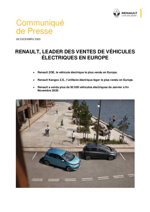 Pionnier de la mobilité électrique, Renault est en tête des ventes sur le marché européen du véhicule électrique (VE) avec 95 985 unités vendues de janvier à fin novembre 2020. Par rapport à l'année précédente, ce chiffre représente une augmentation de 80 % des immatriculations. Cette performance démontre que Renault, avec sa gamme 100% électrique, sait pleinement répondre aux besoins des clients particuliers comme professionnels.
