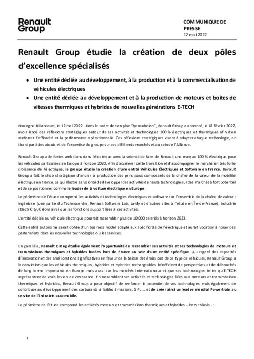 "Renault Group a la conviction que les véhicules thermiques, hybrides et hybrides rechargeables bénéficient de perspectives et de débouchés de long terme importants en Europe mais aussi sur les marchés internationaux", a souligné le groupe français. Il a "pour objectif de renforcer le potentiel de ses technologies mais également de contribuer au développement des carburants à faibles émissions, GPL... et de créer ainsi un leader mondial Powertrain (moteurs) au service de l'industrie automobile".