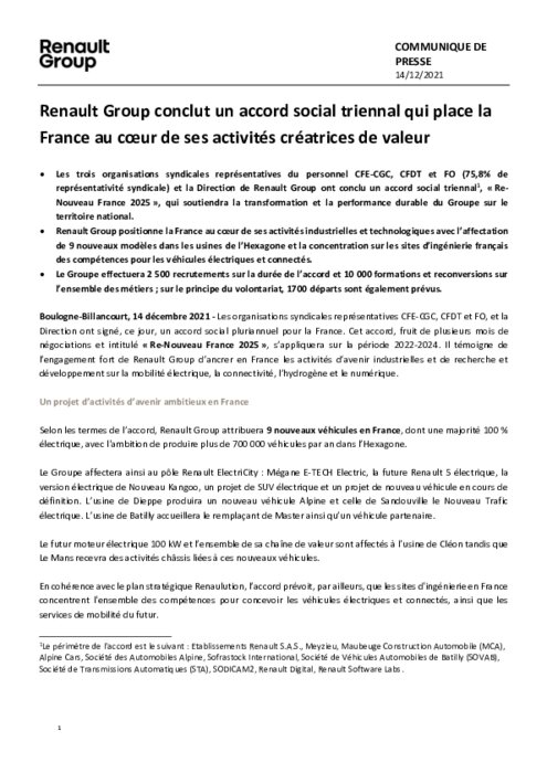 Totalisant 75,8% de représentativité syndicale sur le périmètre concerné par l'accord, les trois syndicats signataires valident avec leur paraphe ce texte baptisé "Re-Nouveau France 2025". Il contient un volet "industriel ambitieux qui vise notamment à faire de la France le coeur du véhicule électrique pour Renault Group" et "le centre de production de moteurs électriques", selon l'accord consulté par l'AFP.