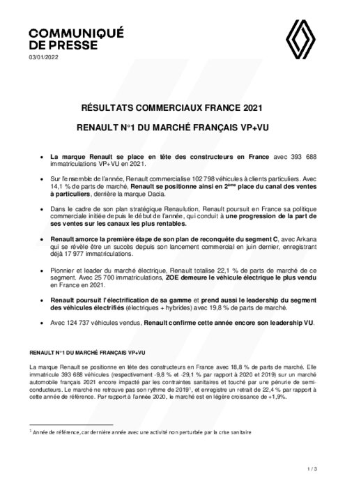 La marque Renault se place en tête des constructeurs en France avec 393 688 immatriculations VP+VU en 2021. Sur l’ensemble de l’année, Renault commercialise 102 798 véhicules à clients particuliers. Avec 14,1 % de parts de marché, Renault se positionne ainsi en 2ème place du canal des ventes à particuliers, derrière la marque Dacia. Dans le cadre de son plan stratégique Renaulution, Renault poursuit en France sa politique commerciale initiée depuis le début de l’année...