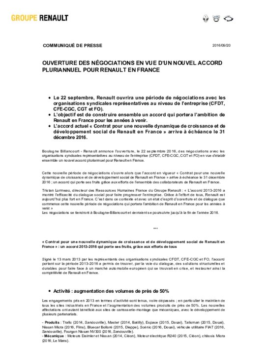 "Grâce à l'effort de tous, Renault est aujourd'hui plus fort en France. C'est dans ce contexte et avec un état d'esprit d'ouverture et de dialogue que commence cette nouvelle période de négociations", dit Tristan Lormeau, DRH France de Renault.