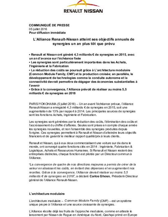 L'alliance automobile franco-japonaise Renault-Nissan a annoncé mardi avoir réalisé en 2015 4,3 milliards d'euros de synergies, "avec un an d'avance sur l'échéance fixée", et vise désormais 5,5 milliards en 2018.