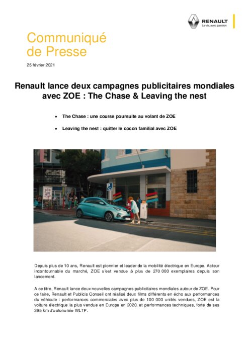 Depuis plus de 10 ans, Renault est pionnier et leader de la mobilité électrique en Europe. Acteur incontournable du marché, ZOE s’est vendue à plus de 270000 exemplaires depuis son lancement. A ce titre, Renault lance deux nouvelles campagnes publicitaires mondiales autour de ZOE. Pour ce faire, Renault et Publicis Conseil ont réalisé deux films différents en écho aux performances du véhicule : performances commerciales avec plus de 100 000 unités vendues, ZOE est la VE la plus vendue en Europe.