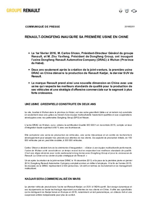 "C'est la première grande étape" pour le développement de Renault sur un marché crucial dont il restait quasi-absent, a déclaré son PDG Carlos Ghosn, lors d'une cérémonie au coeur des installations flambant neuves à Wuhan (centre), importante métropole industrielle sur le fleuve Yangtsé.