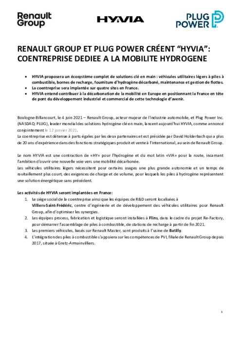 Renault Group, acteur majeur de l'industrie automobile, et Plug Power, leader mondial des solutions hydrogène clé en main, lancent HYVIA, comme annoncé conjointement le 12 janvier 2021. La coentreprise est détenue à parts égales par les deux partenaires et est présidée par David Holderbach qui a plus de 20 ans d'expérience dans des fonctions stratégiques produit et vente à l’international, au sein de Renault Group.