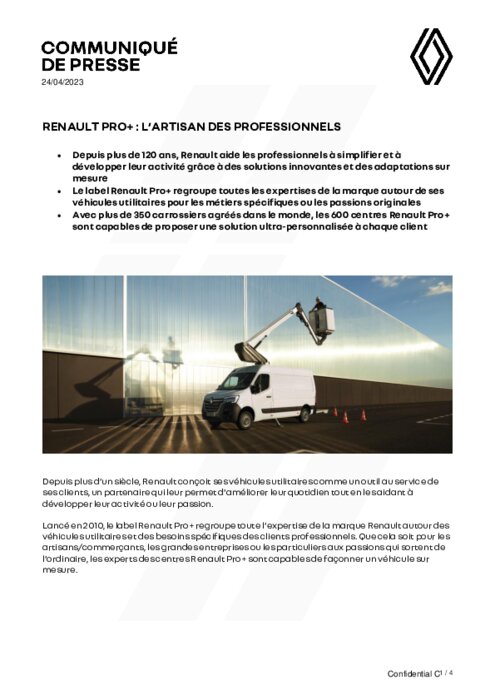 Lancé en 2010, le label Renault Pro+ regroupe toute l’expertise de la marque Renault autour des véhicules utilitaires et des besoins spécifiques des clients professionnels. Que cela soit pour les artisans/commerçants, les grandes entreprises ou les particuliers aux passions qui sortent de l’ordinaire, les experts des centres Renault Pro+ sont capables de façonner un véhicule sur mesure.