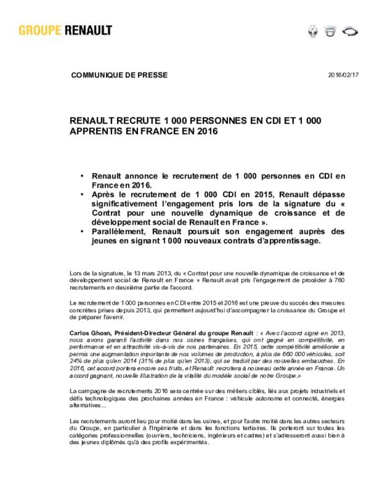 Lors de la signature, le 13 mars 2013, du « Contrat pour une nouvelle dynamique de croissance et de développement social de Renault en France » Renault avait pris l’engagement de procéder à 760 recrutements en deuxième partie de l’accord. Le recrutement de 1 000 personnes en CDI entre 2015 et 2016 est une preuve du succès des mesures concrètes prises depuis 2013, qui permettent aujourd’hui d’accompagner la croissance du Groupe et de préparer l’avenir.