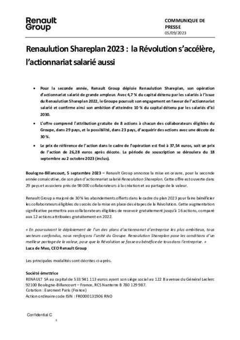 Pour la seconde année, Renault Group déploie Renaulution Shareplan, son opération d’actionnariat salarié de grande ampleur. Avec 4,7 % du capital détenu par les salariés à l’issue du Renaulution Shareplan 2022, le Groupe poursuit son engagement en faveur de l’actionnariat salarié et confirme ainsi son ambition d’atteindre 10 % du capital détenu par les salariés d’ici 2030.