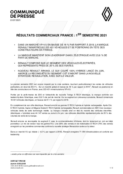 Constructeurs 01 juillet 2021 - 12:22 Dans un marché VP+VU en baisse de 18 % par rapport à 2019, la marque Renault immatricule 223 421 véhicules et se positionne en tête des constructeurs en France. PDF (389 Ko) Télécharger