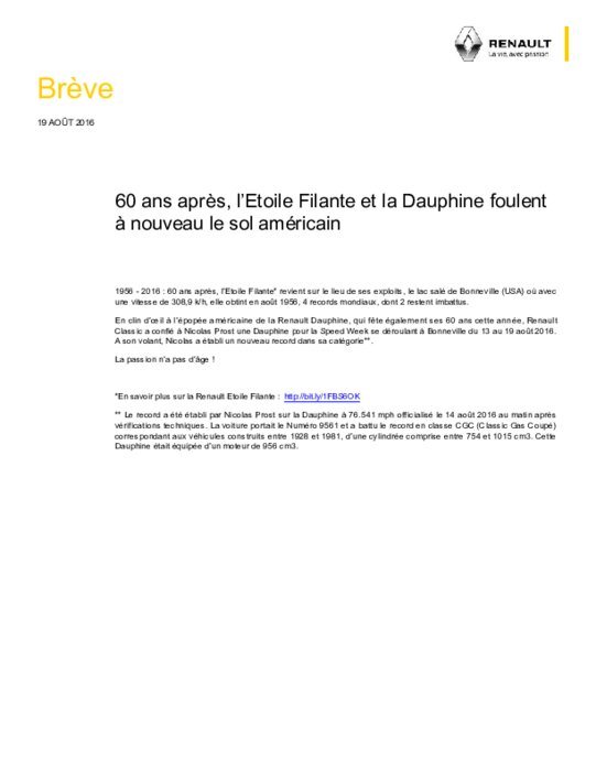 1956-2016 : 60 ans après, l’Etoile Filante* revient sur le lieu de ses exploits, le lac salé de Bonneville (USA) où avec une vitesse de 308,9 k/h, elle obtint en août 1956, 4 records mondiaux, dont 2 restent imbattus. En clin d’œil à l’épopée américaine de la Renault Dauphine, qui fête également ses 60 ans cette année, Renault Classic a confié à Nicolas Prost une Dauphine pour la Speed Week se déroulant à Bonneville du 13 au 19 août 2016.