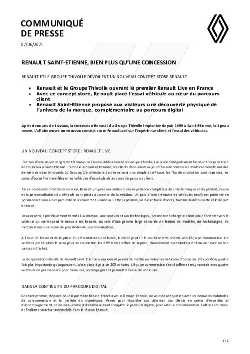 Constructeurs 07 juin 2021 - 14:11 Après deux ans de travaux, la concession Renault du Groupe Thivolle implantée depuis 1959 à Saint-Etienne, fait peau neuve. L'affaire ouvre un nouveau concept store Renault axé sur l'expérience client et l'essai des véhicules. PDF (500 Ko) Télécharger