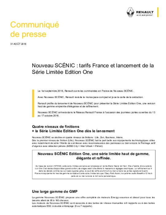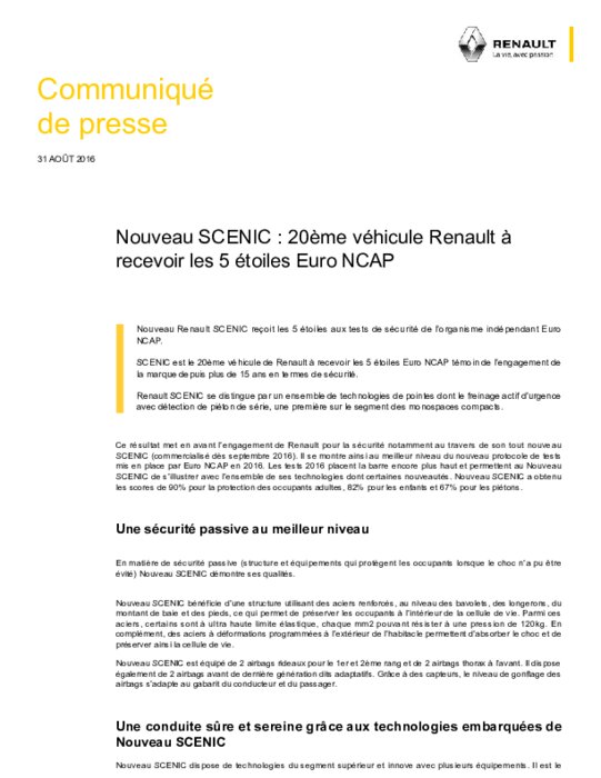 Nouveau Renault SCENIC reçoit les 5 étoiles aux tests de sécurité de l’organisme indépendant Euro NCAP. SCENIC est le 20ème véhicule de Renault à recevoir les 5 étoiles Euro NCAP témoin de l’engagement de la marque depuis plus de 15 ans en termes de sécurité. Renault profite du lancement de Nouveau SCÉNIC pour présenter la Série Limitée Edition One, une version haut de gamme empreinte d’élégance et de raffinement.