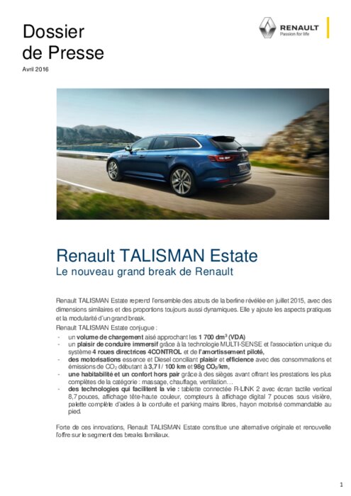 Constructeurs 15 avril 2016 - 09:02 Renault TALISMAN Estate reprend l’ensemble des atouts de la berline révélée en juillet 2015, avec des dimensions similaires et des proportions toujours aussi dynamiques. Elle y ajoute les aspects pratiques et la modularité d’un grand break. PDF (551 Ko) Télécharger