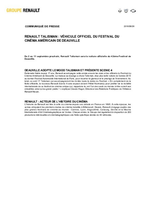 Du 2 au 11 septembre prochain, Renault Talisman sera la voiture officielle du 42ème Festival de Deauville.
