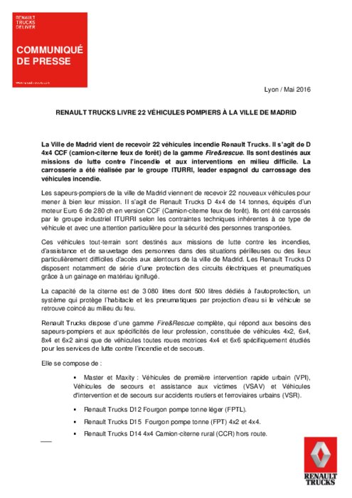 La Ville de Madrid vient de recevoir 22 véhicules incendie Renault Trucks. Il s’agit de D 4x4 CCF (camion-citerne feux de forêt) de la gamme Fire&rescue. Ils sont destinés aux missions de lutte contre l’incendie et aux interventions en milieu difficile. La carrosserie a été réalisée par le groupe ITURRI, leader espagnol du carrossage des véhicules incendie.