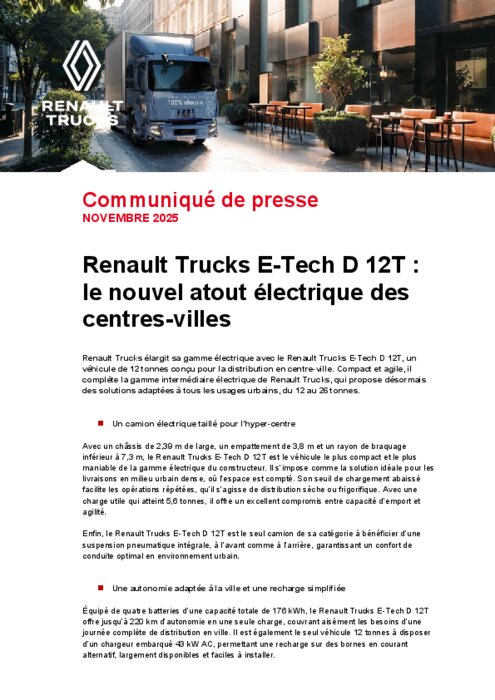 Renault Trucks élargit sa gamme électrique avec le Renault Trucks E-Tech D 12T, un véhicule de 12 tonnes conçu pour la distribution en centre-ville. Compact et agile, il complète la gamme intermédiaire électrique de Renault Trucks, qui propose désormais des solutions adaptées à tous les usages urbains, du 12 au 26 tonnes.