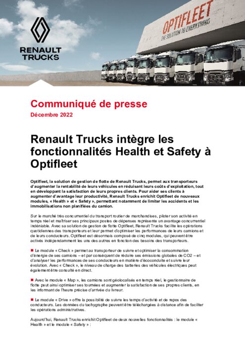 Optifleet, la solution de gestion de flotte de Renault Trucks, permet aux transporteurs d’augmenter la rentabilité de leurs véhicules en réduisant leurs coûts d’exploitation, tout en développant la satisfaction de leurs propres clients. Pour aider ses clients à augmenter d’avantage leur productivité, Renault Trucks enrichit Optifleet de nouveaux modules, « Health » et « Safety », permettant notamment de limiter les accidents et les immobilisations non planifiées du camion.