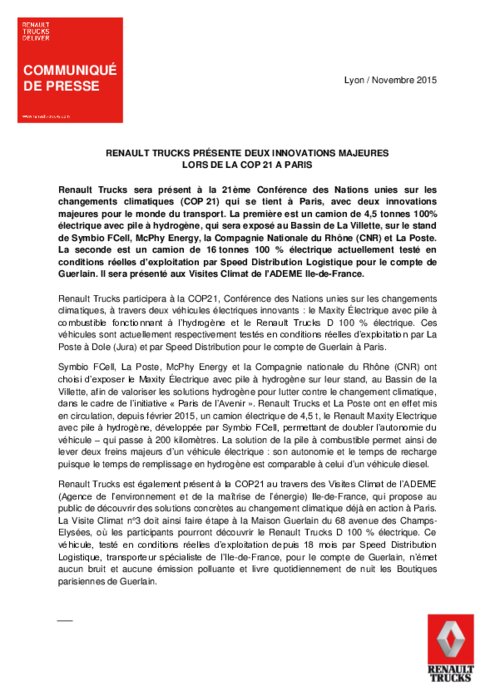 Renault Trucks sera présent à la COP 21 qui se tient à Paris, avec deux innovations majeures pour le monde du transport. La première est un camion de 4,5 tonnes 100% électrique avec pile à hydrogène, qui sera exposé au Bassin de La Villette, sur le stand de Symbio FCell, McPhy Energy, la CNR et La Poste. La seconde est un camion de 16 tonnes 100 % électrique actuellement testé en conditions réelles d’exploitation par Speed Distribution Logistique pour le compte de Guerlain.