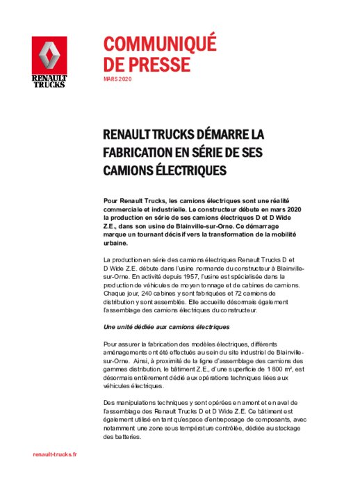 Pour Renault Trucks, les camions électriques sont une réalité commerciale et industrielle. Le constructeur débute en mars 2020 la production en série de ses camions électriques D et D Wide Z.E., dans son usine de Blainville-sur-Orne. Ce démarrage marque un tournant décisif vers la transformation de la mobilité urbaine.