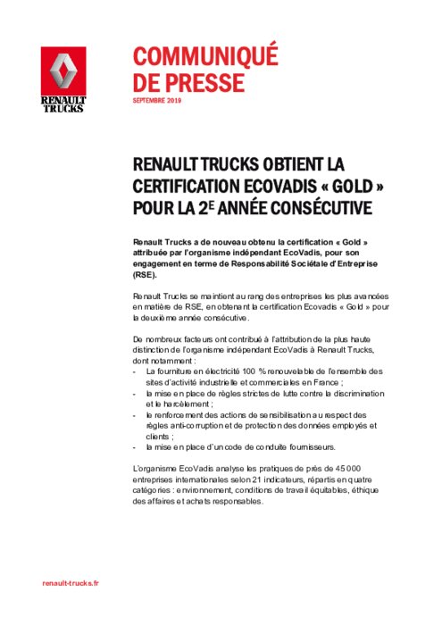 Constructeurs 04 octobre 2019 - 07:30 Renault Trucks a de nouveau obtenu la certification "Gold" attribuée par l’organisme indépendant EcoVadis, pour son engagement en terme de Responsabilité Sociétale d’Entreprise (RSE). PDF (145 Ko) Télécharger