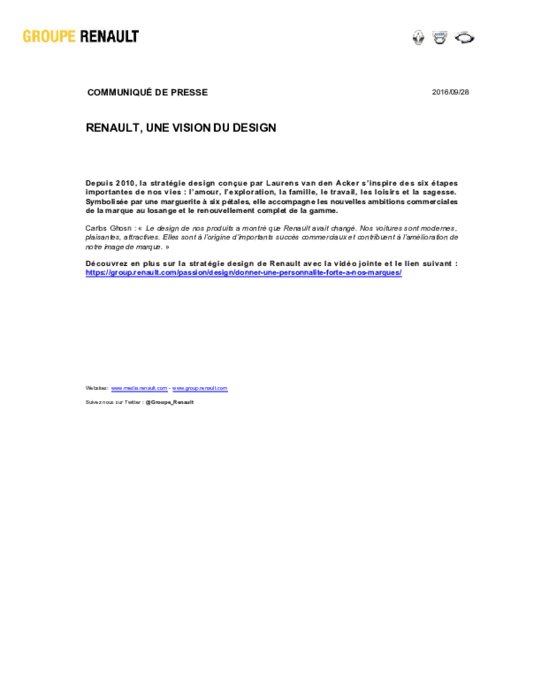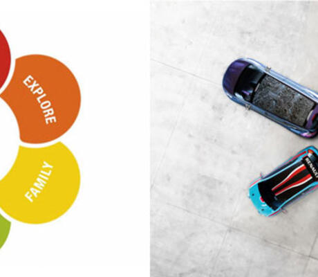 Depuis 2010, la stratégie design conçue par Laurens van den Acker s’inspire des six étapes importantes de nos vies : l’amour, l’exploration, la famille, le travail, les loisirs et la sagesse. Symbolisée par une marguerite à six pétales, elle accompagne les nouvelles ambitions commerciales de la marque au losange et le renouvellement complet de la gamme.