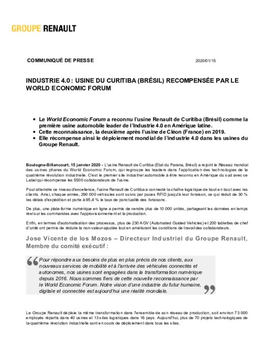 L’usine Renault de Curitiba (Etat du Parana, Brésil) a rejoint le Réseau mondial des usines phares du World Economic Forum, qui regroupe les leaders dans l'application des technologies de la quatrième révolution industrielle. C’est le premier site industriel automobile à être reconnu en Amérique du sud avec ce Label qui récompense les 5500 collaborateurs de l’usine.