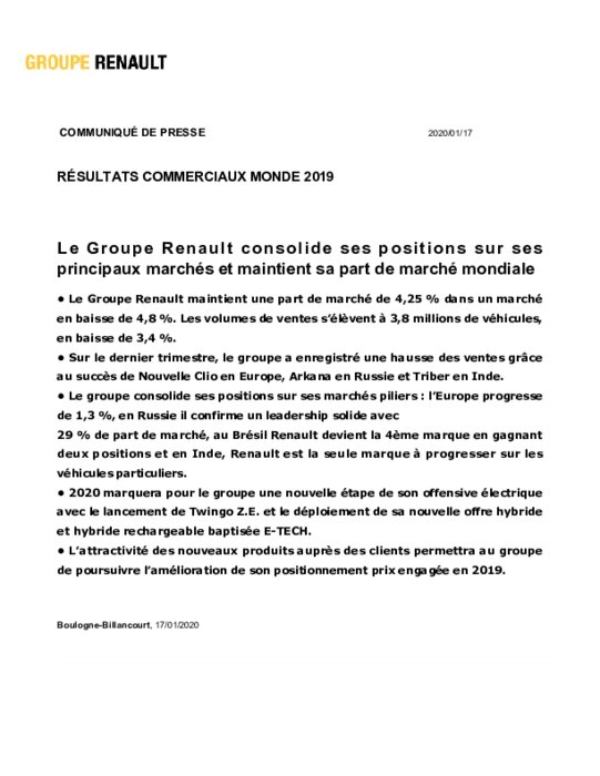 Le directeur commercial, Olivier Murguet, a cependant constaté que la marque s'était stabilisée au deuxième semestre 2019 après une baisse de ses ventes de 4% au premier semestre. "Cela va mieux", a-t-il commenté lors d'une table ronde avec des journalistes, espérant "une nouvelle impulsion" en 2020 grâce au renouvellement des "best-sellers" Clio et Captur.