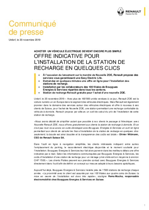 Avec plus de 160’000 unités vendues à ce jour, Renault ZOE est la voiture numéro un en Europe dans le segment des véhicules électriques. Mais Renault est également pionnier dans le domaine des services autour des véhicules électriques et offre à nouveau à ses clients de Suisse, pour l’achat de Nouvelle ZOE, une station permettant une recharge confortable du véhicule à domicile. Renault propose par ailleurs un outil de calcul du prix de l’installation de cette station de recharge.
