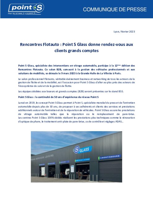 Point S Glass, spécialiste des interventions en vitrage automobile, participe à la 12ème édition des Rencontres Flotauto. Ce salon B2B, consacré à la gestion des véhicules professionnels et aux solutions de mobilités, se déroule le 9 mars 2023 à la Grande Halle de La Villette à Paris.