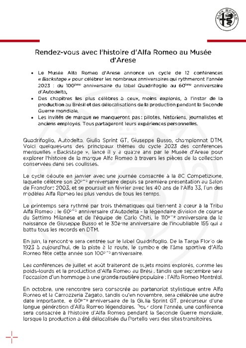 Le Musée Alfa Romeo d’Arese annonce un cycle de 12 conférences « Backstage » pour célébrer les nombreux anniversaires qui rythmeront l’année 2023 : du 100ème anniversaire du label Quadrifoglio au 60ème anniversaire d'Autodelta. Des chapitres les plus célèbres à ceux, moins explorés, à l’instar de la production au Brésil et des délocalisations de la production pendant la Seconde Guerre mondiale.
