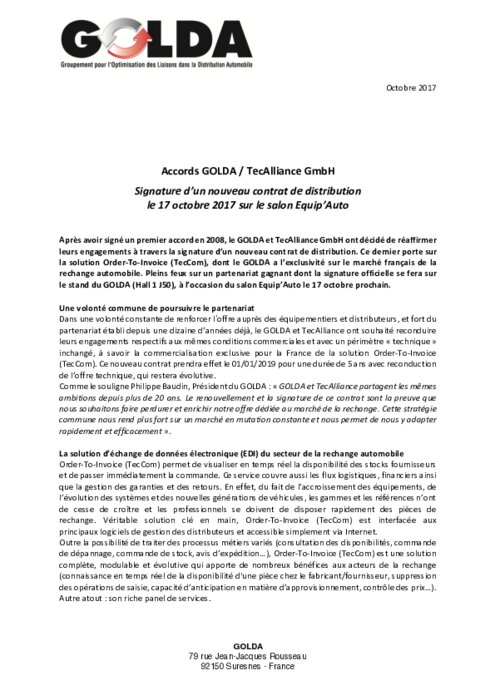 Après avoir signé un premier accord en 2008, le GOLDA et TecAlliance ont décidé de réaffirmer leurs engagements à travers la signature d' un nouveau contrat de distribution. Ce dernier porte sur la solution Order-To-Invoice (TecCom), dont le GOLDA a l' exclusivité sur le marché français de la rechange automobile. Pleins feux sur un partenariat gagnant dont la signature officielle se fera sur le stand du GOLDA (Hall 1 J50), à l' occasion du salon Equip' Auto le 17 octobre prochain.
