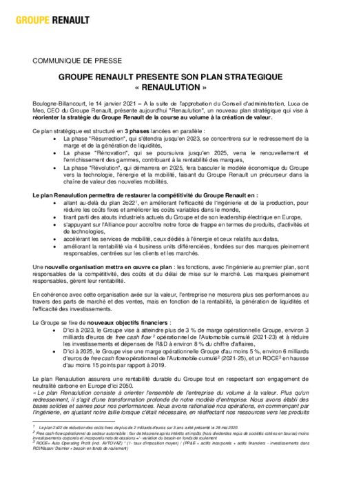 "On passe des volumes à la valeur", a ajouté M. De Meo en présentant son plan "Renaulution". Le but: dégager plus de 3% de marge opérationnelle d'ici à 2023, et un total d'environ 3 milliards d'euros de flux de trésorerie.