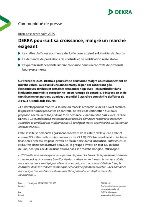 Sur l'exercice 2025, DEKRA a poursuivi sa croissance malgré un environnement de marché volatil. Au cours d'une année marquée par des conditions géo-économiques tendues et certaines tendances négatives - en particulier dans l'industrie automobile européenne - notre Groupe de contrôle, d'inspection et de certification est parvenu au niveau mondial à accroître son chiffre d'affaires de 3,4 %, à 4,4 milliards d'euros.