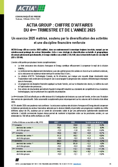 Actia Group clôt un exercice 2025 maîtrisé, dans un environnement économique toujours incertain, marqué par un ralentissement prolongé du secteur Automotive. Grâce à une stratégie de diversification sectorielle et géographique désormais pleinement opérationnelle, le Groupe stabilise son activité à 535,4 M€, dans la fourchette haute de son objectif (525 à 535 M€).