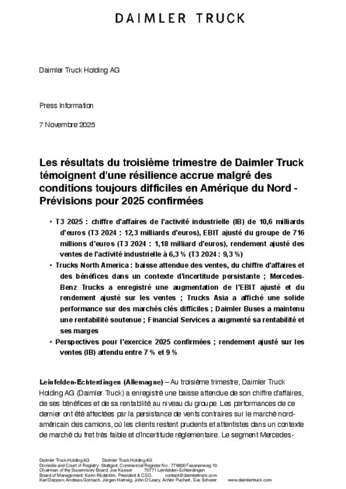 Au troisième trimestre, Daimler Truck Holding AG (Daimler Truck) a enregistré une baisse attendue de son chiffre d'affaires, de ses bénéfices et de sa rentabilité au niveau du groupe. Les performances de ce dernier ont été affectées par la persistance de vents contraires sur le marché nordaméricain des camions, où les clients restent prudents et attentistes dans un contexte de marché du fret très faible et d'incertitude réglementaire.