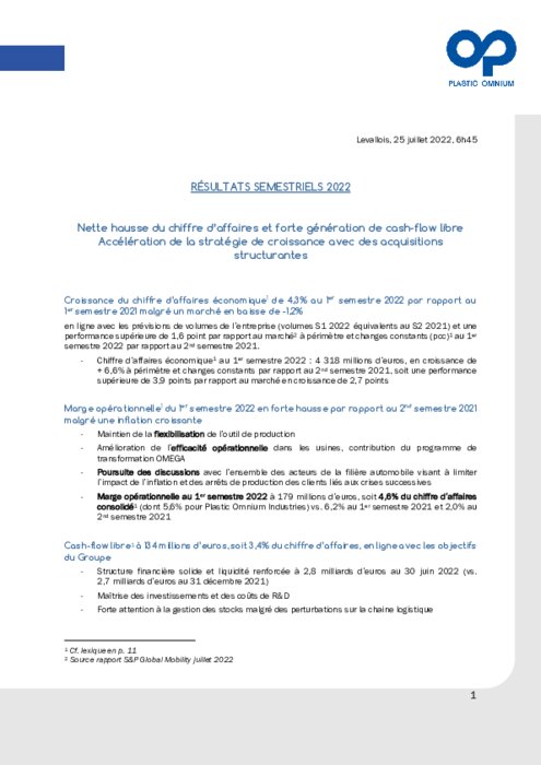 Malgré des "mesures de flexibilisation et d'atténuation de l'impact de l'inflation", Plastic Omnium a publié une marge opérationnelle en baisse, à 4,6% au premier semestre 2022 contre 6,2% sur la même période en 2021.