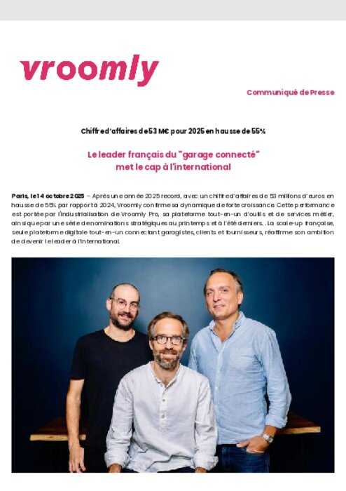 Après une année 2025 record, avec un chiffre d’affaires de 53 millions d’euros en hausse de 55% par rapport à 2024, Vroomly confirme sa dynamique de forte croissance. Cette performance est portée par l'industrialisation de Vroomly Pro, sa plateforme tout-en-un d’outils et de services métier, ainsi que par une série de nominations stratégiques au printemps et à l’été derniers. . La scale-up française, seule plateforme digitale tout-en-un connectant garagistes, clients et fournisseurs, réaffirme son ambition de devenir le leader à l’international.