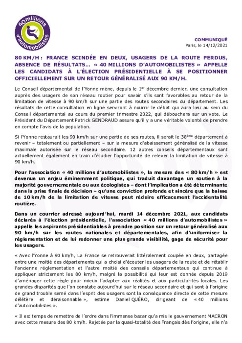Pour l’association « 40 millions d’automobilistes », la mesure des « 80 km/h » est devenue un enjeu éminemment politique, qui traduit davantage un soutien à la majorité gouvernementale ou aux écologistes – dont l’implication a été déterminante dans la prise finale de décision – qu’une conviction profonde et sincère que la baisse de 10 km/h de la limitation de vitesse peut réduire efficacement l’accidentalité routière.