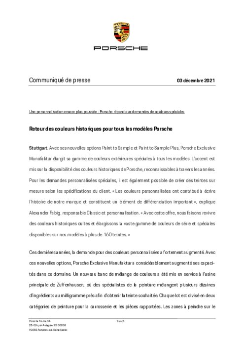 Avec ses nouvelles options Paint to Sample et Paint to Sample Plus, Porsche Exclusive Manufaktur élargit sa gamme de couleurs extérieures spéciales à tous les modèles. L'accent est mis sur la disponibilité des couleurs historiques de Porsche, reconnaissables à travers les années. Pour les demandes personnalisées spéciales, il est également possible de créer des teintes sur mesure selon les spécifications du client...