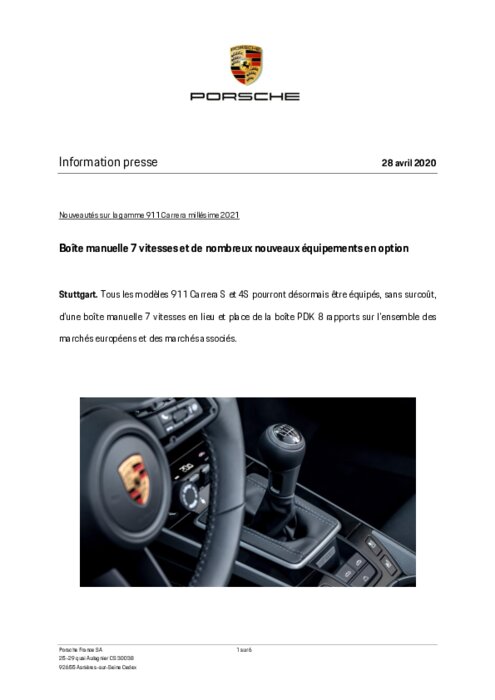 Constructeurs 28 avril 2020 - 14:58 Tous les modèles 911 Carrera S et 4S pourront désormais être équipés, sans surcoût, d'une boîte manuelle 7 vitesses en lieu et place de la boîte PDK 8 rapports sur l'ensemble des marchés européens et des marchés associés. PDF (654 Ko) Télécharger