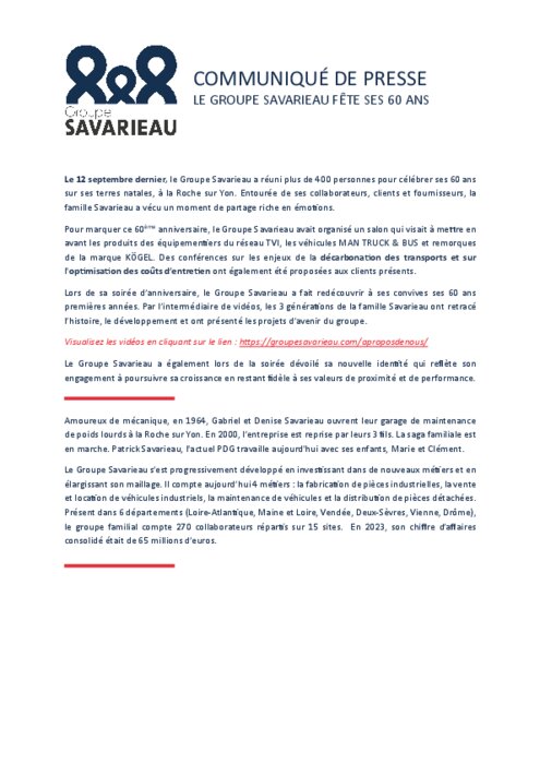 Pour marquer ce 60ème anniversaire, le Groupe Savarieau avait organisé un salon qui visait à mettre en avant les produits des équipementiers du réseau TVI, les véhicules MAN Truck & Bus et remorques de la marque Kögel. Des conférences sur les enjeux de la décarbonation des transports et sur l'optimisation des coûts d’entretien ont également été proposées aux clients présents.