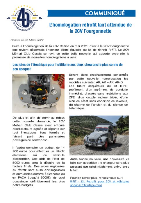 Suite à l’homologation de la 2CV Berline en mai 2021, c’est à la 2CV Fourgonnette que revient désormais l’honneur d’être équipée du kit de rétrofit R-FIT. Le 2CV Méhari Club Cassis se ravit de cette belle nouvelle qui apporte avec elle la promesse de nouvelles homologations à venir.