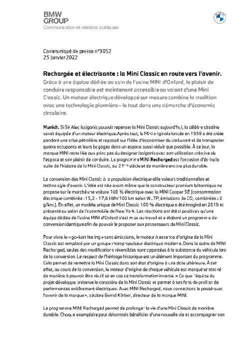 Après avoir présenté un concept électrique en 2018, le constructeur a mis en place une offre officielle de retrofit dans son usine d'Oxford (Royaume-Uni) appelée "Mini Recharged" et présentée mardi dans un communiqué.