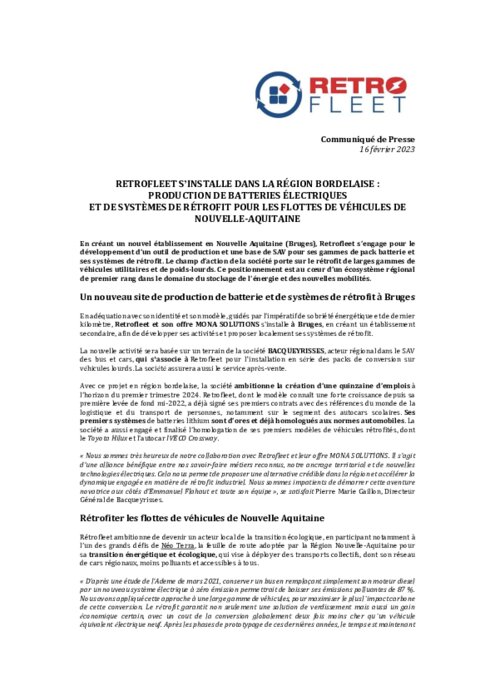 En créant un nouvel établissement en Nouvelle Aquitaine (Bruges), Retrofleet s’engage pour le développement d’un outil de production et une base de SAV pour ses gammes de pack batterie et ses systèmes de rétrofit. Le champ d’action de la société porte sur le rétrofit de larges gammes de véhicules utilitaires et de poids-lourds. Ce positionnement est au cœur d’un écosystème régional de premier rang dans le domaine du stockage de l’énergie et des nouvelles mobilités.