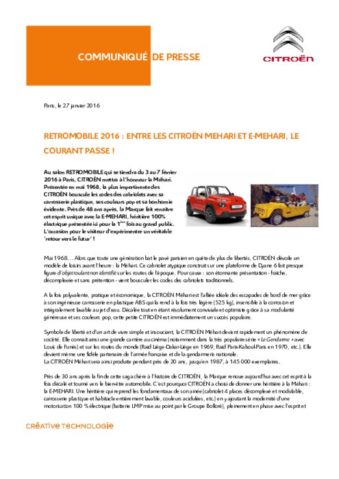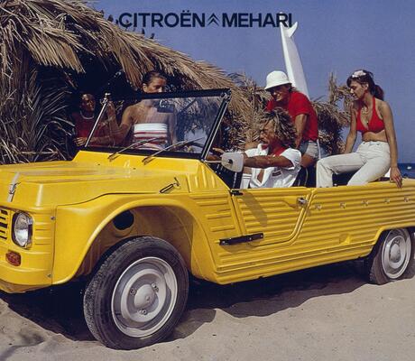 Au salon RETROMOBILE qui se tiendra du 3 au 7 février 2016 à Paris, CITROËN mettra à l’honneur la Méhari. Présentée en mai 1968, la plus impertinente des CITROËN bouscule les codes des cabriolets avec sa carrosserie plastique, ses couleurs pop et sa bonhomie évidente. Près de 48 ans après, la Marque fait renaître cet esprit unique avec la E-MEHARI, héritière 100% électrique présentée ici pour la 1ère fois au grand public.